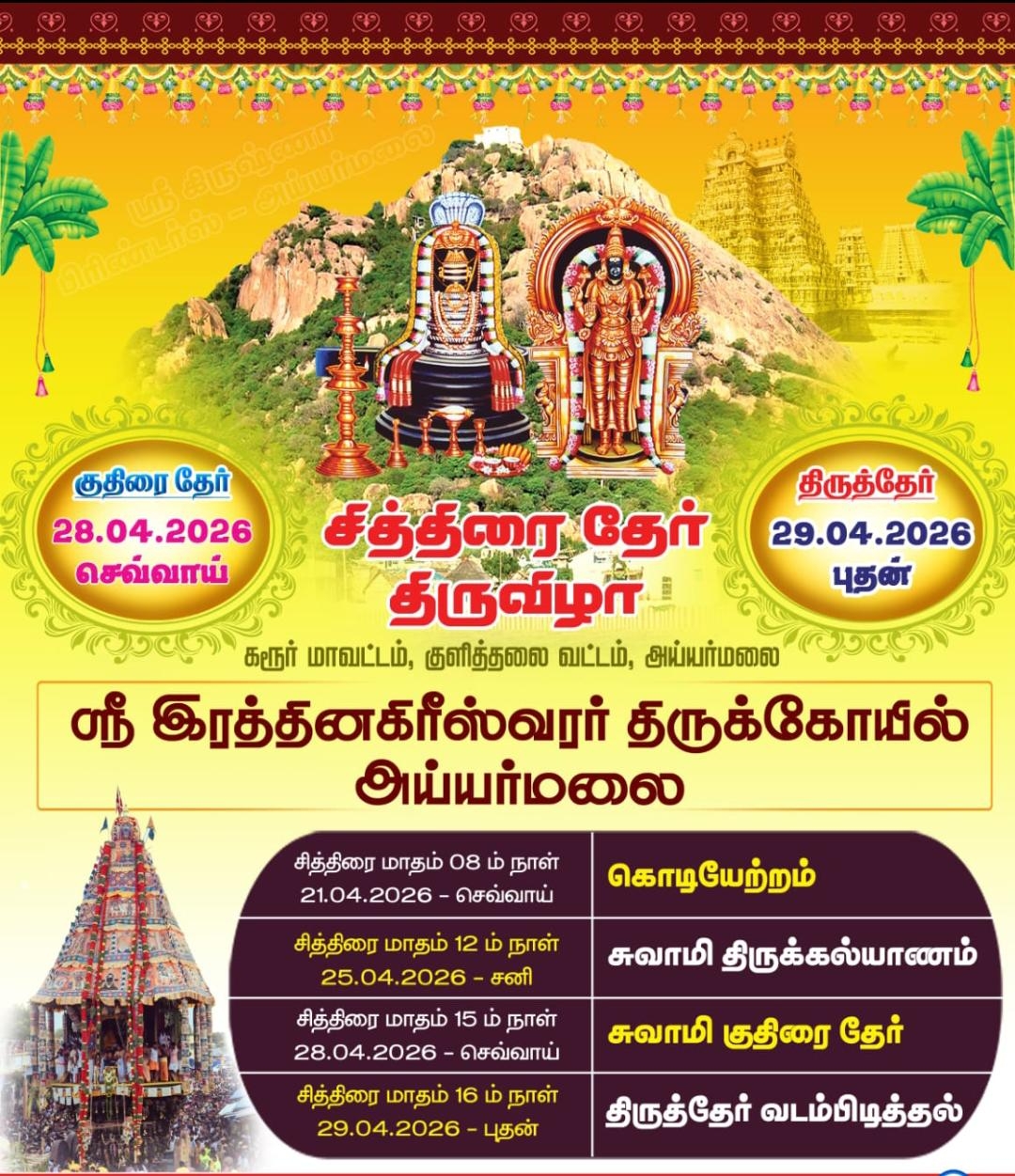 பக்திப் பெருக்குடன் அய்யர்மலை ரத்தினகிரீஸ்வரர் கோவில் சித்திரை தேர் திருவிழா 2026: முழு விவரங்கள்!