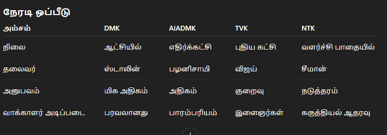 தமிழ்நாட்டின் அரசியல் வரலாறு பல தசாப்தங்களாக Dravidian கட்சிகளால் ஆளப்பட்டு வருகிறது. ஆனால் சமீப காலங்களில் புதிய கட்சிகள் உருவாகி, அரசியல் போட்டியை மேலும் தீவிரமாக்கியுள்ளன. இன்றைய அரசியல் சூழலில் முக்கியமாக பேசப்படும் நான்கு கட்சிகள் — Dravida Munnetra Kazhagam (DMK), All India Anna Dravida Munnetra Kazhagam (AIADMK), Tamilaga Vettri Kazhagam (TVK), மற்றும் Naam Tamilar Katchi (NTK). இவை ஒவ்வொன்றும் தனித்துவமான கொள்கைகள் மற்றும் வாக்காளர் அடிப்படையைக் கொண்டுள்ளன.
