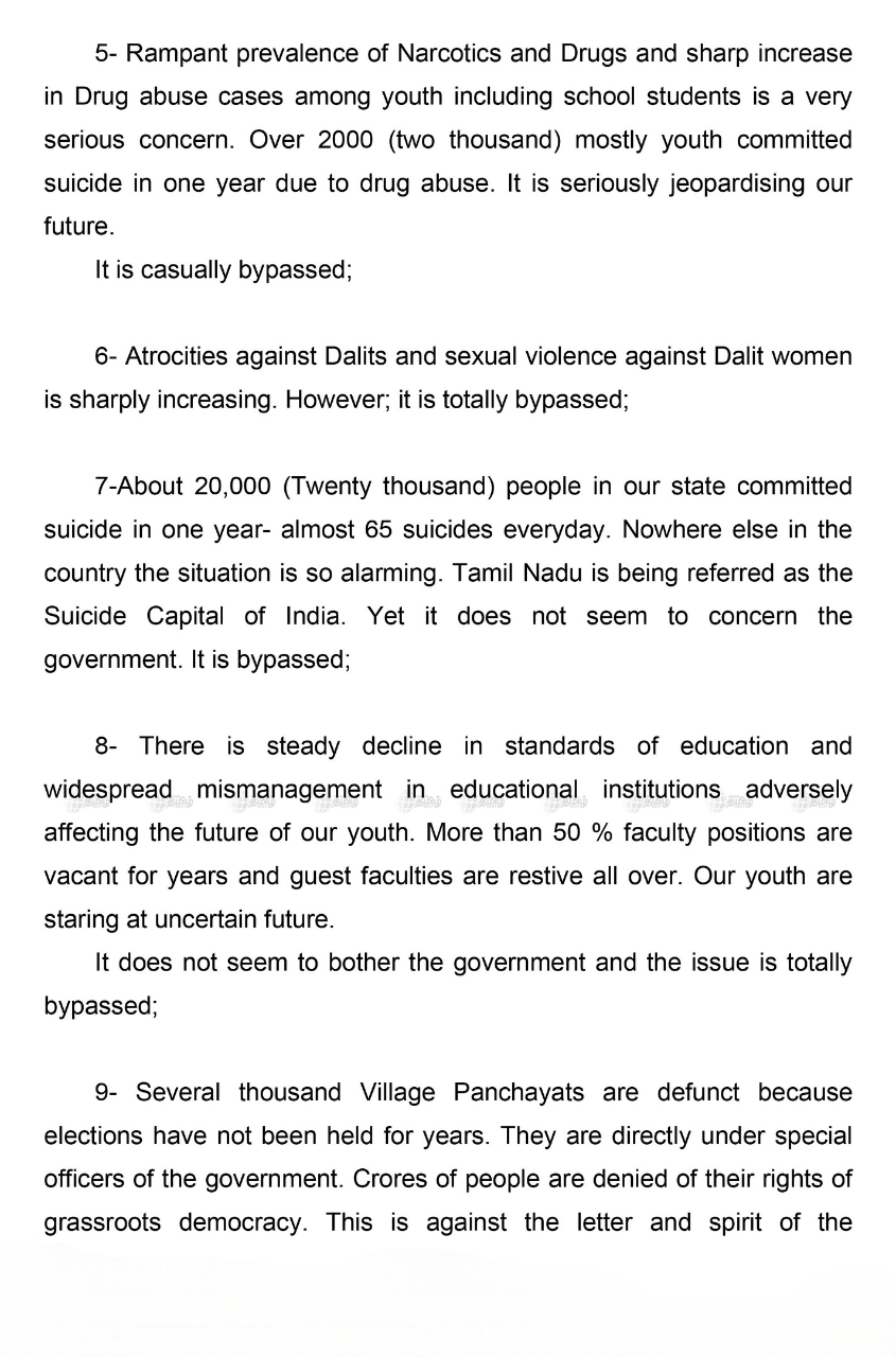 தலித் & பெண்கள் பாதுகாப்பு: தமிழகத்தில் பெண்கள் மற்றும் தலித் மக்கள் மீதான வன்கொடுமைகள் அதிகரித்துள்ள நிலையில், அதுகுறித்த தகவல்கள் உரையில் முற்றிலும் புறக்கணிக்கப்பட்டுள்ளன.
