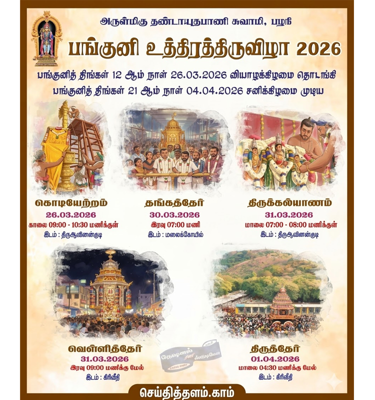 பங்குனி உத்திரத் திருவிழா, 26.03.2026 (வியாழக்கிழமை) அன்று முறைப்படி கொடியேற்றத்துடன் தொடங்குகிறது.
