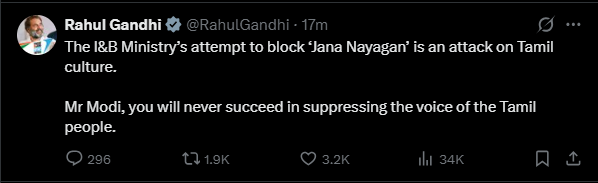 இந்த விவகாரத்தில் தனது எக்ஸ் (X) தளத்தில் பதிவிட்டுள்ள ராகுல் காந்தி, இது ஒரு படத்தின் பிரச்சனை அல்ல, ஒட்டுமொத்த தமிழர்களின் அடையாளத்திற்கான பிரச்சனை எனக் கூறியுள்ளார்.