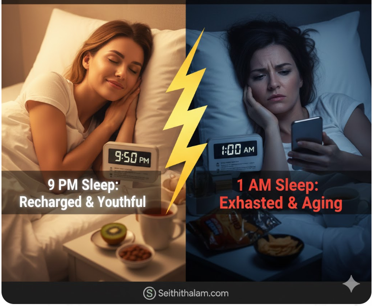 இன்றைய டிஜிட்டல் உலகில், ஸ்மார்ட்போன் மற்றும் பணிச்சுமை காரணமாக பலரும் நள்ளிரவு 1 மணி அல்லது அதற்கு மேல் தூங்குவதை ஒரு பழக்கமாகவே மாற்றிவிட்டனர். ஆனால், நீங்கள் தாமதமாகத் தூங்கும் ஒவ்வொரு மணி நேரமும் உங்கள் ஆயுளையும், அழகையும் சேர்த்தே குறைக்கிறது என்பது உங்களுக்குத் தெரியுமா?