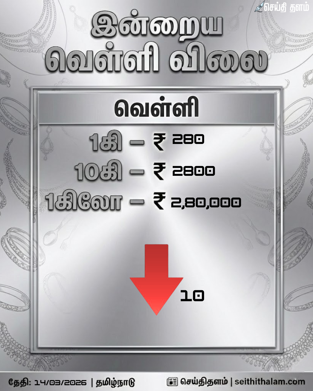 வெள்ளி விலையும் இன்று சரிவைக் கண்டுள்ளது. கடந்த சில நாட்களில் கிலோ ₹3 லட்சத்தைத் தாண்டி விற்பனையான வெள்ளி, தற்போது ₹2.80 லட்சம் என்ற நிலைக்கு வந்துள்ளது.
