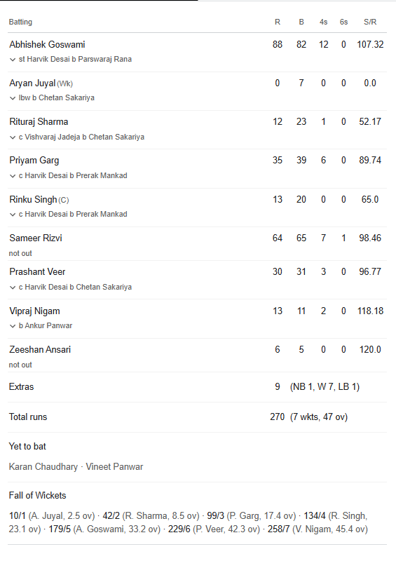 | பேட்டிங் (UP) | அபிஷேக் கோஸ்வாமி (சதத்தை நெருங்குகிறார்) |